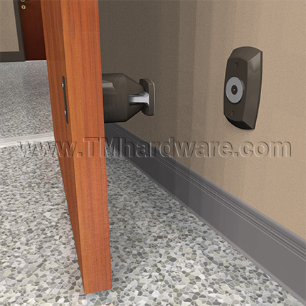 This wall-mounted 998M electromagnetic door holder from Rixson has a total projection of 3-5/8". Their principal function is maintaining the open position of fire and smoke barrier doors until a remote smoke detector or other switching device activates them.