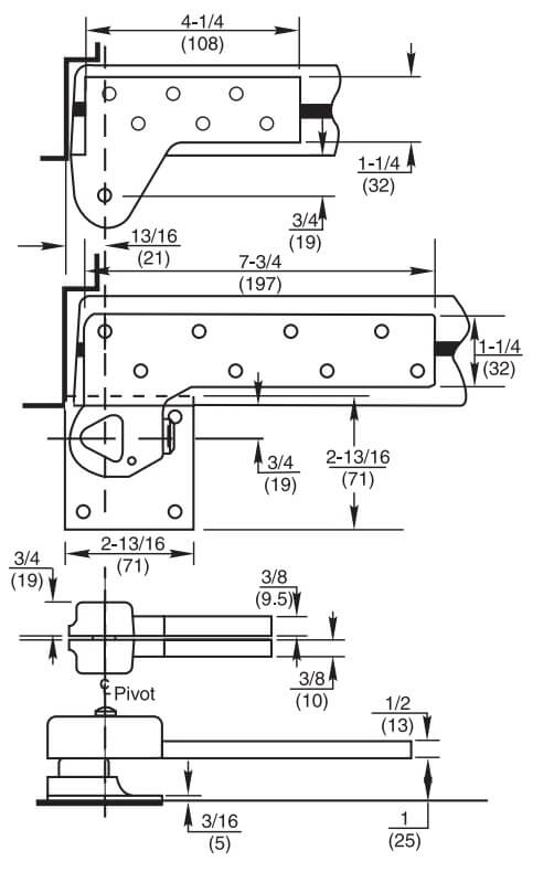 - Screw holes in top pivot and bottom arm spaced to straddle lead lining in the middle of the door