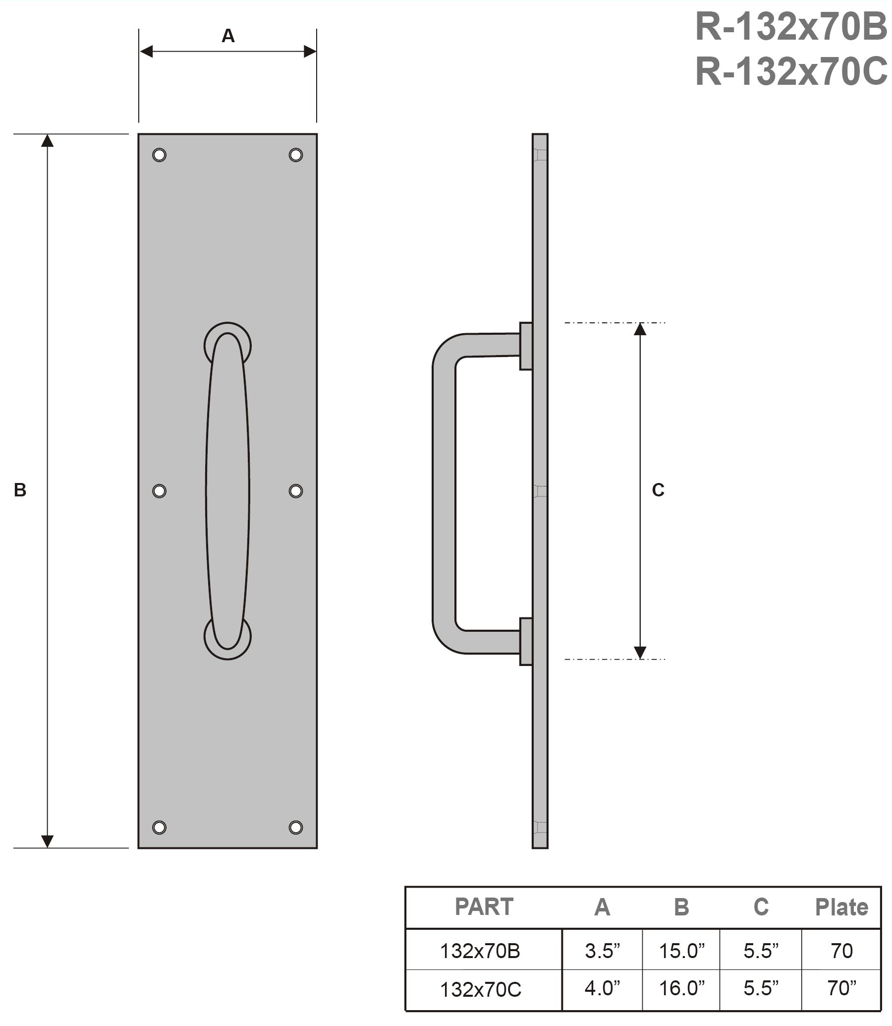 Rockwood 132x70 standard weight pull plate series is architectural grade and long lasting. They are all for standard doors (1.75" thick), but can be custom made for any door of your choice. These simply decorative door pull plates are great for all standard doors, especially those in high traffic areas.Â