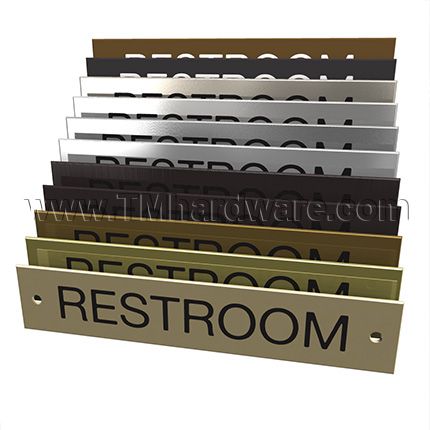 Bathroom Signage "RESTROOM" wording Engraved on Solid Brass or Plastic. Font is 1" US Block with 1/8" wide stroke. Available in a variety of finishes.