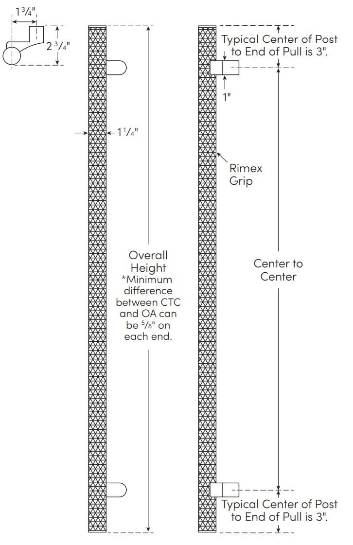 The RM3481 NeoMax - Post Mounted GripZones, Offset Pull with End Caps from Rockwood have a distinctive, wave-like pattern that accentuates the 1-1/4" diameter grip, adding visual depth and giving users a tactile experience. These durable product is  offered with straight posts, with a full-length grip area.