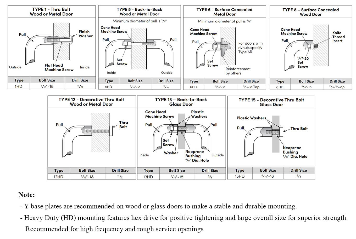 Mount DesignType 1HD - Thru Bolt Heavy Duty (Wood or Metal), Type 5HD - *Back-to-Back Heavy Duty (Wood or Metal), Type 6HD - Surface Concealed Heavy Duty (Metal Door), Type 8HD - Surface Concealed Heavy Duty (Wood Door), Type 12HD - Decorative Thru Bolt Heavy Duty (Wood or Metal), Type 13HD - *Back-to-Back Heavy Duty (Glass Door), Type 15HD - Decorative Thru Bolt Heavy Duty (Glass Door)
