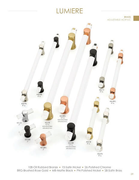 Schaub #404-10B Acrylic cabinet pull is part of the Lumiere collection from Schaub contemporary style series. Contemporary style utilizes the materials and techniques of craftmanship of the 21st century to create a range of design aesthetics. Sophistication and beauty combine to create an alluring array of fine cabinet knobs, handles and pulls.Â