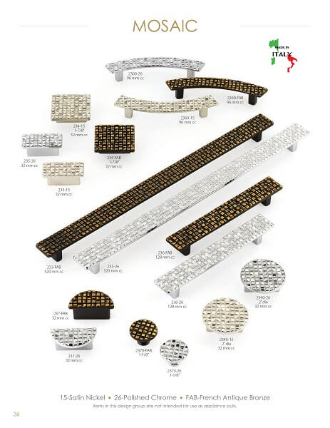 Schaub 233-15 Decorative cabinet pull, with a satin nickel finish is part of the Mosaic collection from Schaub contemporary style series. See description below for dimensions and finishes.