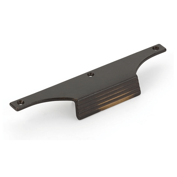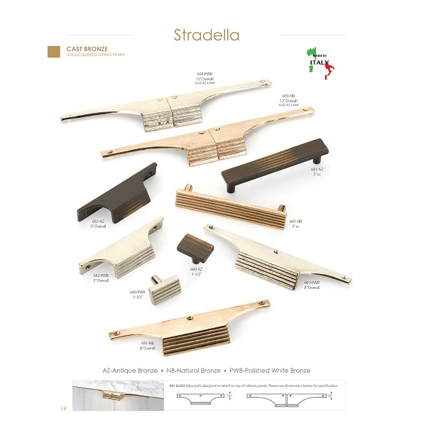 Schaub #691-AZ edge pull, is part of the Stradella collection from Schaub rustic style series. Pull is made of cast bronze with an array of finishes available. See description below for dimensions and additional products and finishes in this collection.