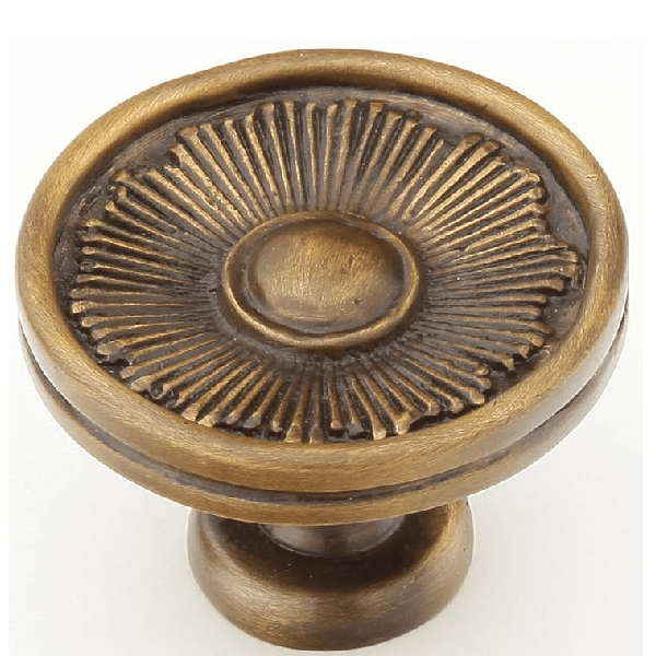 Schaub #972-ED Round cabinet knob is part of the Sunburst collection from Schaub Symphony Elegance series. Knob is made of solid brass and available in a variety of finishes. See description below for dimensions and finishes.