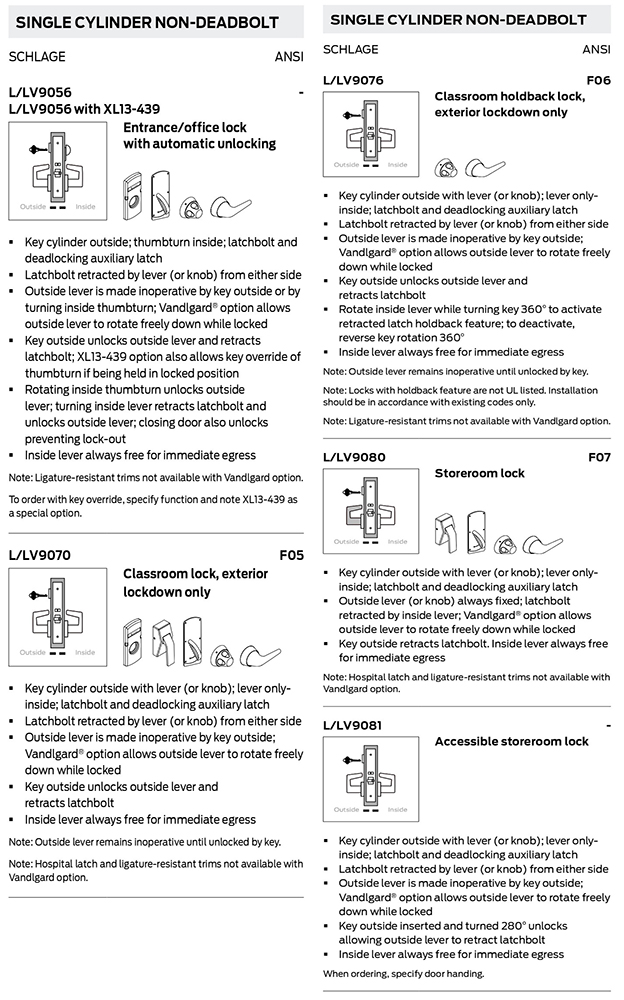 FunctionVandlgard Entrance/Office Lock, Vandlgard entrance/office lock with automatic unlocking, Vandlgard entrance/office lock with automatic unlocking and outside key override feature with XL13-439, Vandlgard classroom lock, exterior lockdown only, Vandlgard classroom holdback lock, exterior lockdown only, Vandlgard Storeroom Lock, Vandlgard accessible storeroom lock, Vandlgard electrically locking outside lever, outside cylinder, Vandlgard electrically unlocking outside lever, outside cylinder, Vandlgard electrically locking both levers, outside cylinder, Vandlgard electrically unlocking both levers, outside cylinder