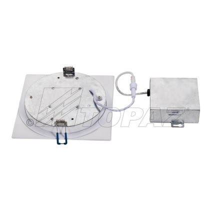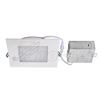 Topaz Slim Fit LED High Lumens Recessed Downlights, 6" Square 3000K CCT, 12W, Smooth Trim have a low profile design that makes mounting in small ceiling spaces or soffits easy. They are intended for new or retrofit applications. This small, simple-to-install fixture installs into the ceiling without the need for separate housing. Connect the low voltage cable to the fixture, wire and install the J-box, and then fasten the fixture to the ceiling using the included spring clips. This unit is dimmable with cutting-edge incandescent-style or LED dimmers and is IC-rated and damp location-rated.