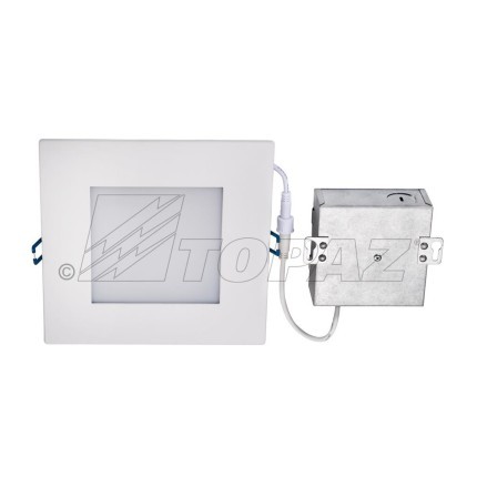 Topaz Slim Fit Recessed Downlights, 6" Square 3000K CCT, 12W, Smooth Trim have a low profile design that makes mounting in small ceiling spaces or soffits easy. They are intended for new or retrofit applications. This small, simple-to-install fixture installs into the ceiling without the need for separate housing. Connect the low voltage cable to the fixture, wire and install the J-box, and then fasten the fixture to the ceiling using the included spring clips. This unit is dimmable with cutting-edge incandescent-style or LED dimmers and is IC-rated and damp location-rated.