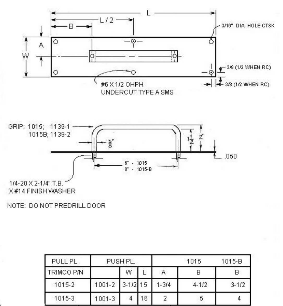 The Trimco 1015 Series Half-Round Pull Plates integrate a 1139 Series Grip with a 1001 Series Plate. These ADA-compliant pull plates are matched with a cast 6" or 8″ CTC conventional pull and come in standard plate sizes of 3-1/2″x15″ and 4″x16″ . Available in a variety of finishes.