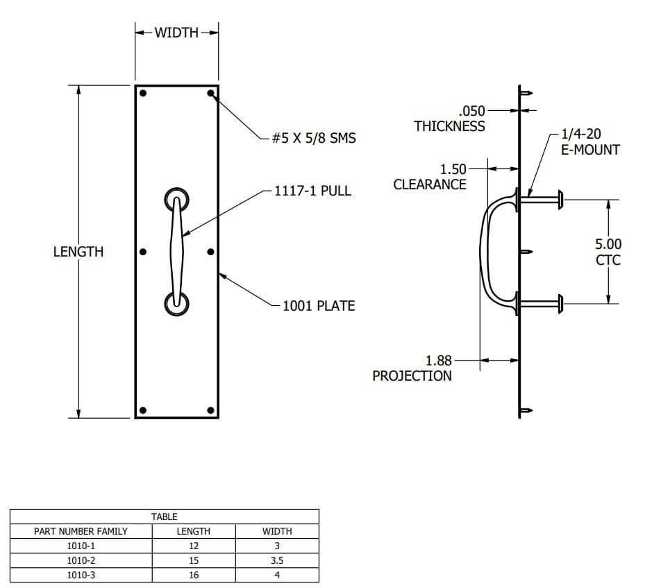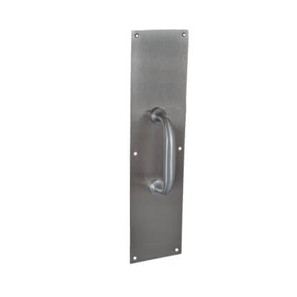 The Trimco 1010 Series Pull Plates integrate a 1117 Series Grip with a 1001 Series Plate. These ADA-compliant pull plates are matched with a cast 5" CTC conventional pull and come in standard plate sizes of 3 x 12, 3-1/2 x 15, and 4 x 16. Available in a variety of finishes.