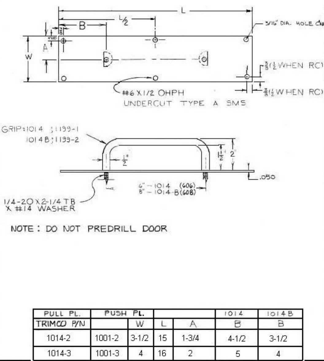The Trimco 1014 Series Half-Round Pull Plates integrate a 1199 Series Grip with a 1001 Series Plate. These ADA-compliant pull plates are matched with a cast 6" or 8″ CTC conventional pull and come in standard plate sizes of 3-1/2″x15″ and 4″x16″ . Available in a variety of finishes.