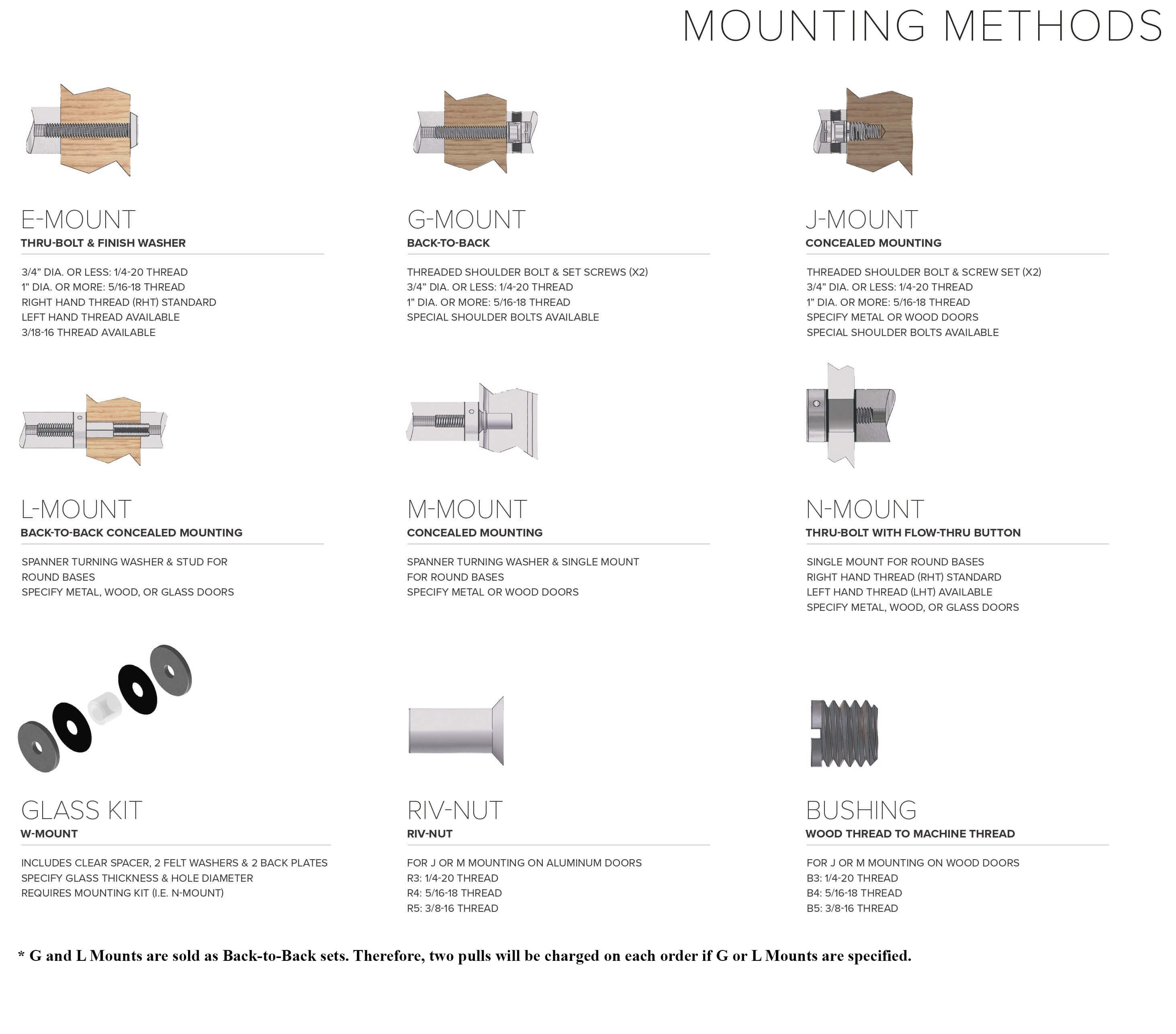 Mount DesignE - Mount: Thru-bolt & Washer (Standard), G - Mount: Back-to-Back - Pull Set*, J - Mount: Concealed Mounting, J - Mount: Concealed Mounting with Riv-Nut (for Metal Doors), J - Mount: Concealed Mounting with Bushing (for Wood Doors), L - Mount: Back-to-Back Concealed Mounting - Pull Set*, M - Mount: Concealed Mounting, M - Mount: Concealed Mounting with Riv-Nut (for Metal Doors), M - Mount: Concealed Mounting with Bushing (for Wood Doors), N - Mount: Thru-bolt with Flow-thru Button
