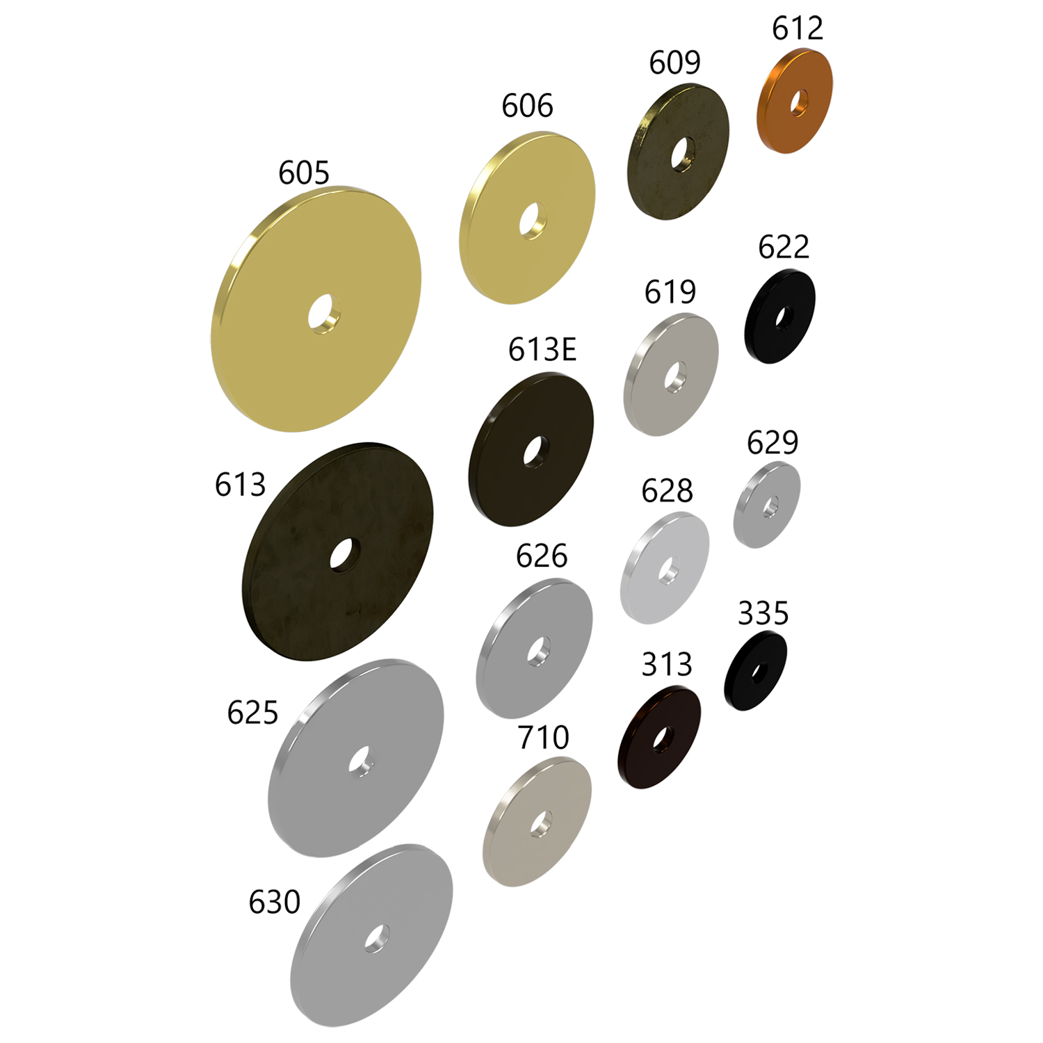 FinishBright Brass (605), Satin Brass (606), Oil Rubbed Bronze (613), Dark Satin Bronze, Equiv (613e), Flat Black (622), Bright Chrome Plated (625), Satin Chrome Plated (626), Satin Aluminum, Clear Anodized (628), Bright Stainless Steel (629), Satin Stainless Steel (630)