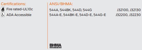 Compliance DetailsFire Rated, ADA Compliant, BHMA Certified, UL Classified
